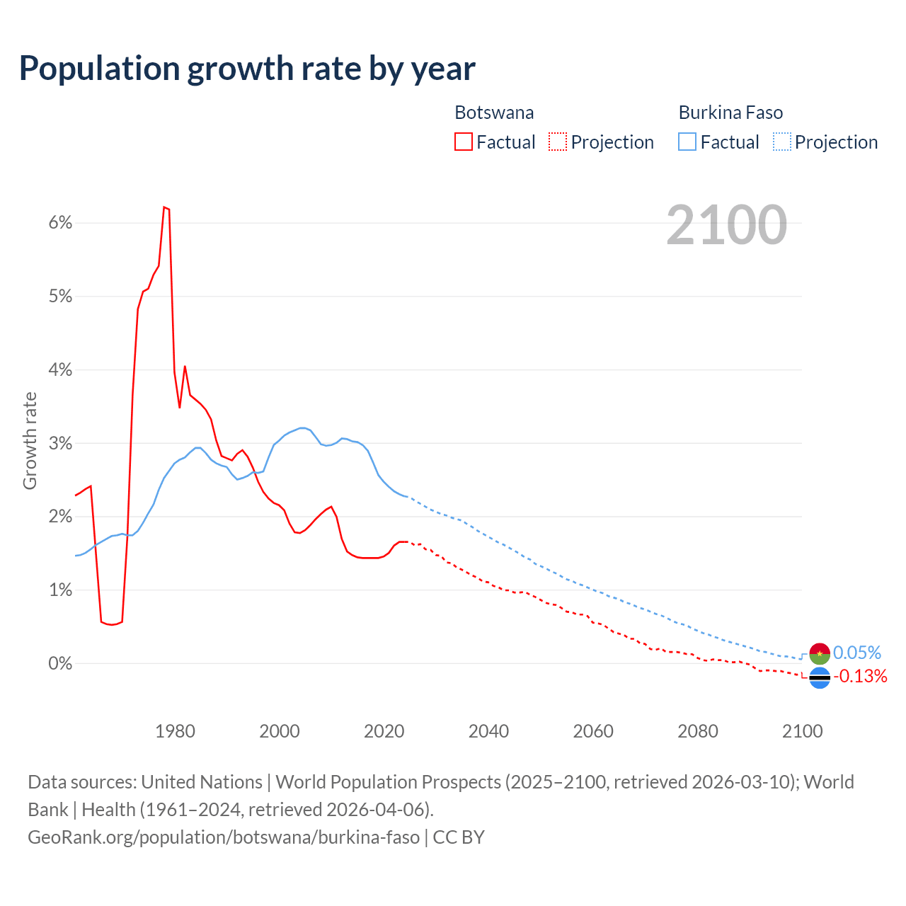 - For the last 10 years, Botswana has had an average growth rate of +1.5% per year vs +2.63% in Burkina Faso.
