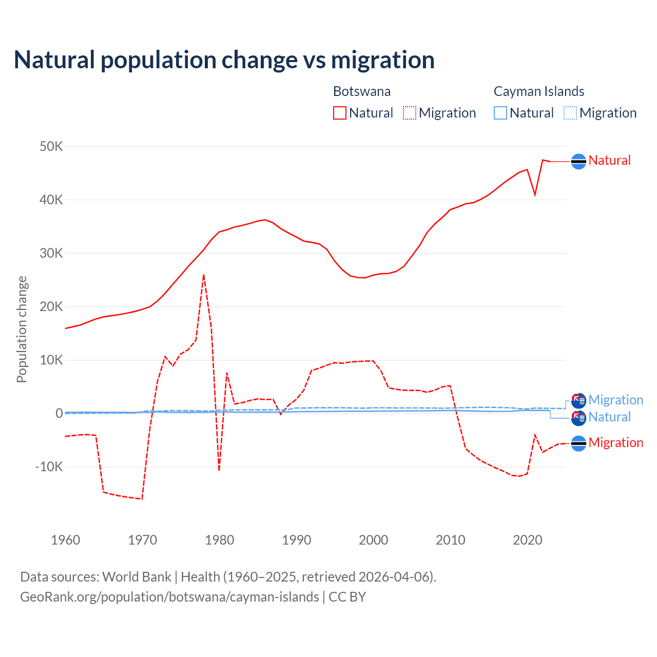 Over the last 10 years, 82.5% of the population change in Botswana is from natural causes (a gain of 436,373 people) and 17.5% is from migration (a loss of 92,293 people). In the Cayman Islands 31.1% is from natural causes (a gain of 4,468 people) and 68.9% is from migration (a gain of 9,879 people).