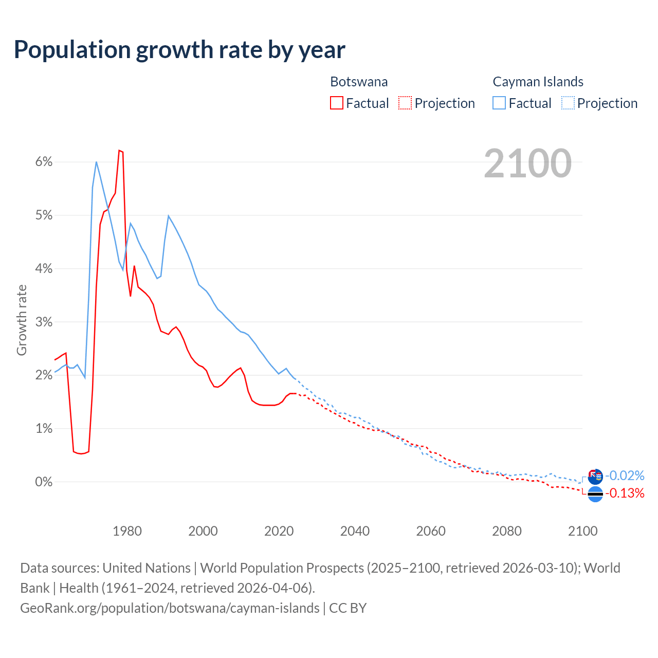 - For the last 10 years, Botswana has had an average growth rate of +1.5% per year vs +2.19% in the Cayman Islands.