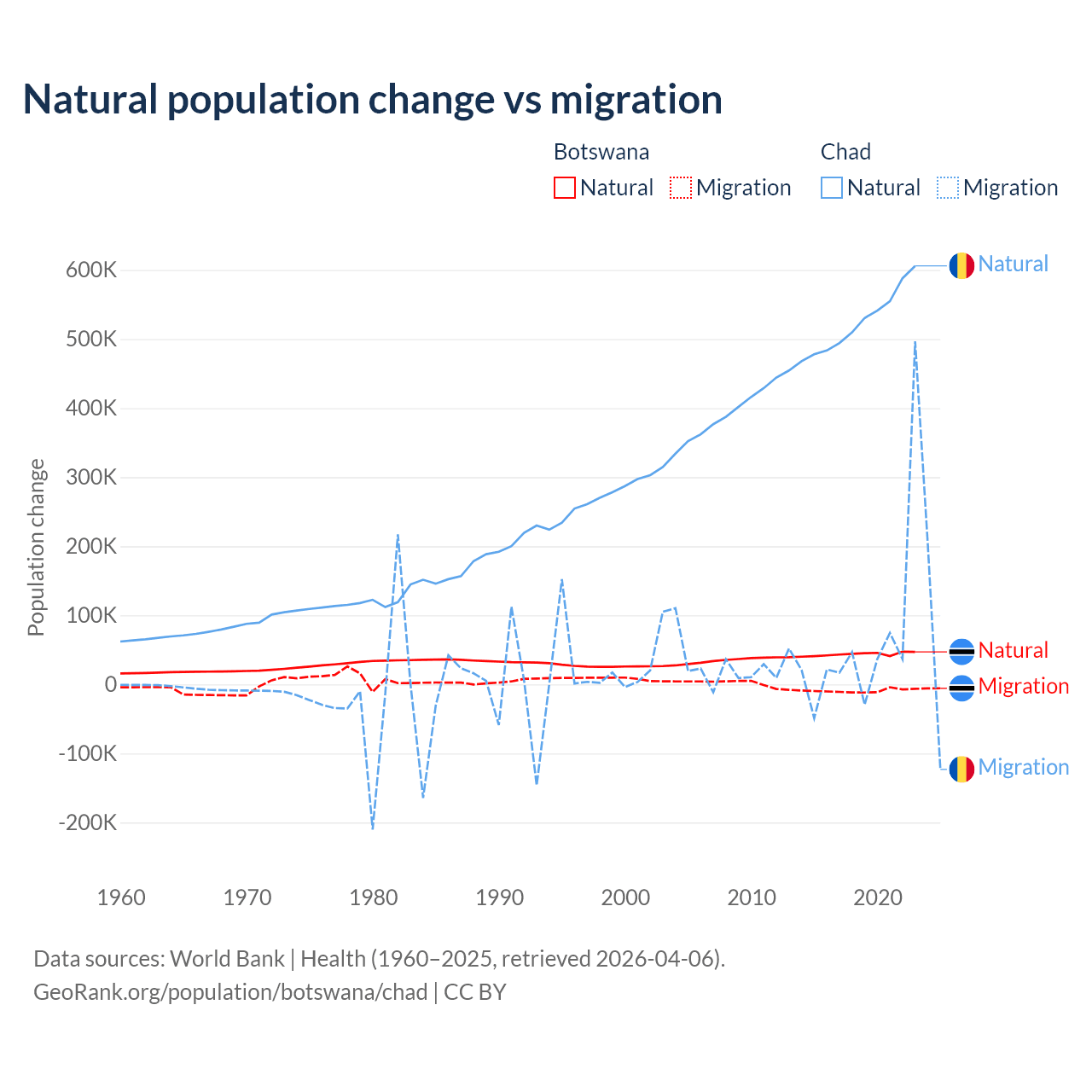 Over the last 10 years, 82.5% of the population change in Botswana is from natural causes (a gain of 436,373 people) and 17.5% is from migration (a loss of 92,293 people). In Chad 88.7% is from natural causes (a gain of 5,253,964 people) and 11.3% is from migration (a gain of 672,204 people).