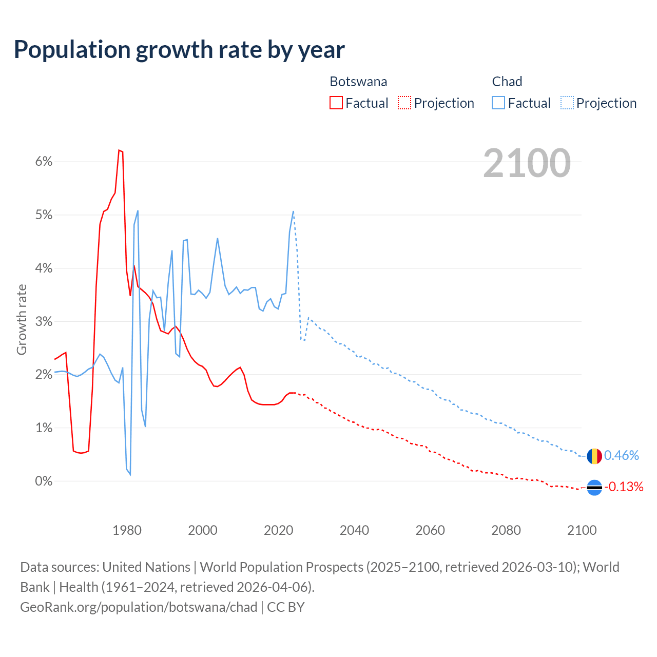 - For the last 10 years, Botswana has had an average growth rate of +1.5% per year vs +3.65% in Chad.