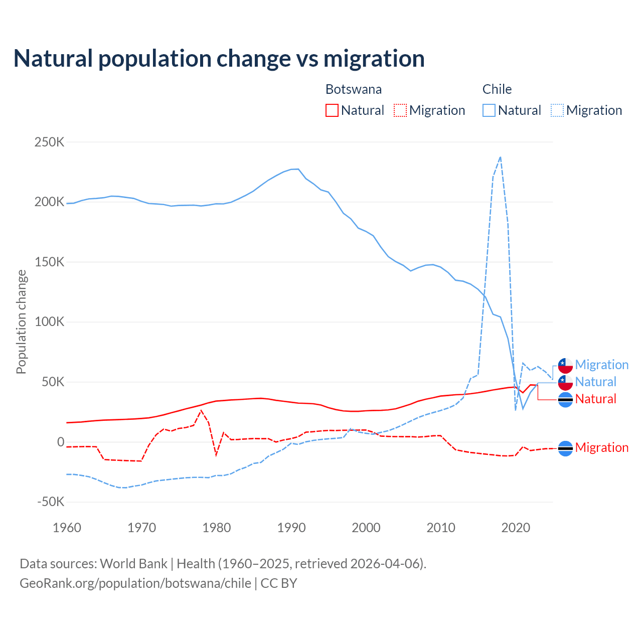 Over the last 10 years, 82.5% of the population change in Botswana is from natural causes (a gain of 436,373 people) and 17.5% is from migration (a loss of 92,293 people). In Chile 43.5% is from natural causes (a gain of 844,683 people) and 56.5% is from migration (a gain of 1,097,597 people).