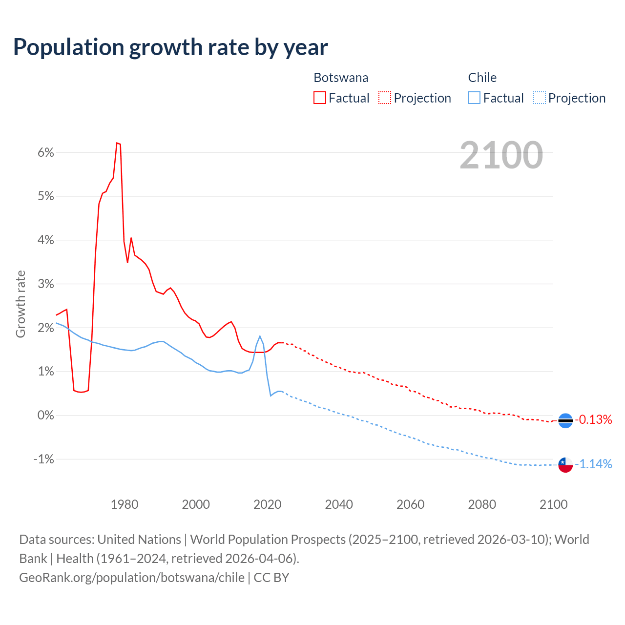 - For the last 10 years, Botswana has had an average growth rate of +1.5% per year vs +1.02% in Chile.