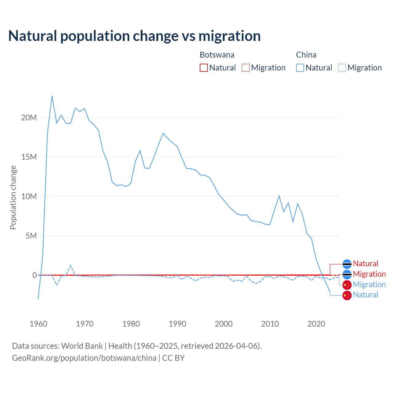 Over the last 10 years, 82.5% of the population change in Botswana is from natural causes (a gain of 436,373 people) and 17.5% is from migration (a loss of 92,293 people). In China 92.5% is from natural causes (a gain of 42,414,528 people) and 7.53% is from migration (a loss of 3,452,923 people).