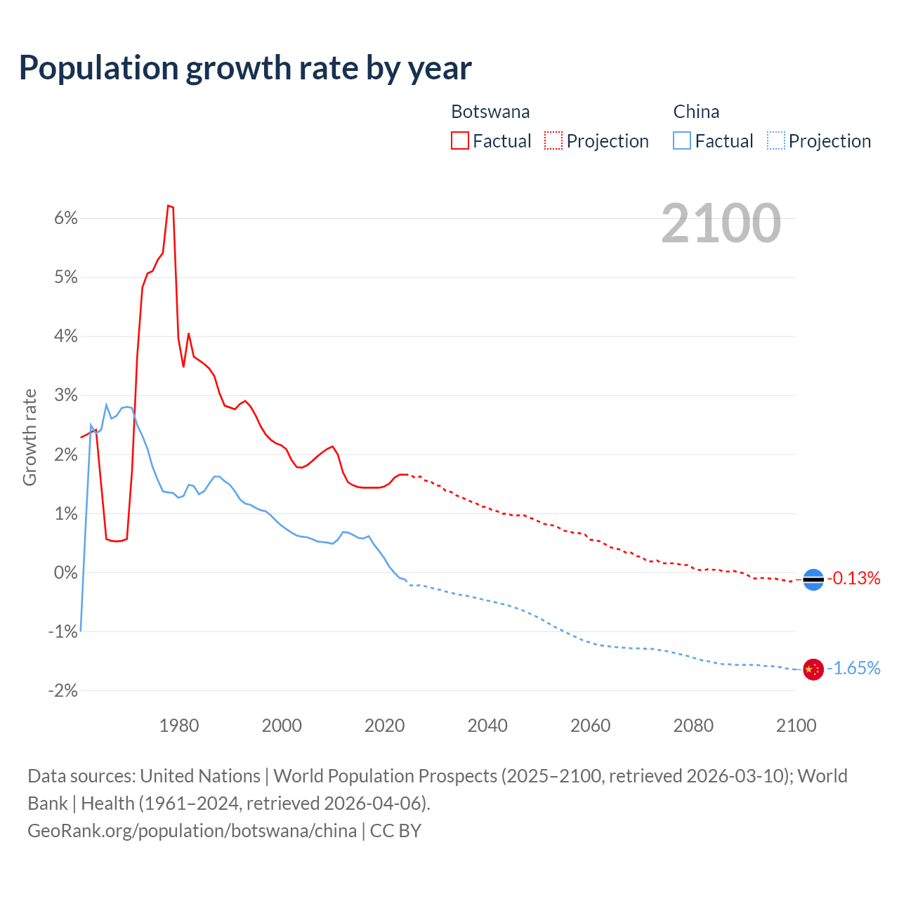 - For the last 10 years, Botswana has had an average growth rate of +1.5% per year vs +0.3% in China.