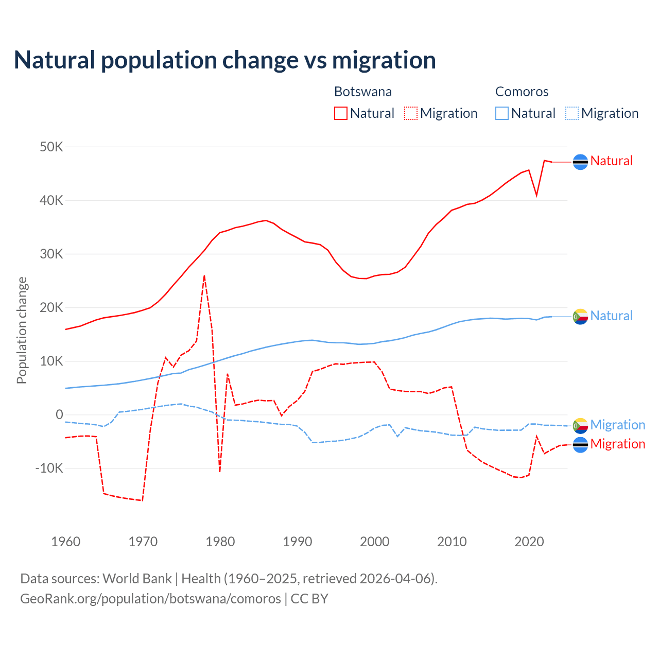 Over the last 10 years, 82.5% of the population change in Botswana is from natural causes (a gain of 436,373 people) and 17.5% is from migration (a loss of 92,293 people). In Comoros 87.9% is from natural causes (a gain of 179,319 people) and 12.1% is from migration (a loss of 24,709 people).