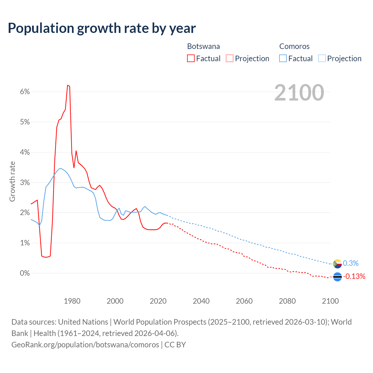 Botswana vs Comoros: population by year and forecast