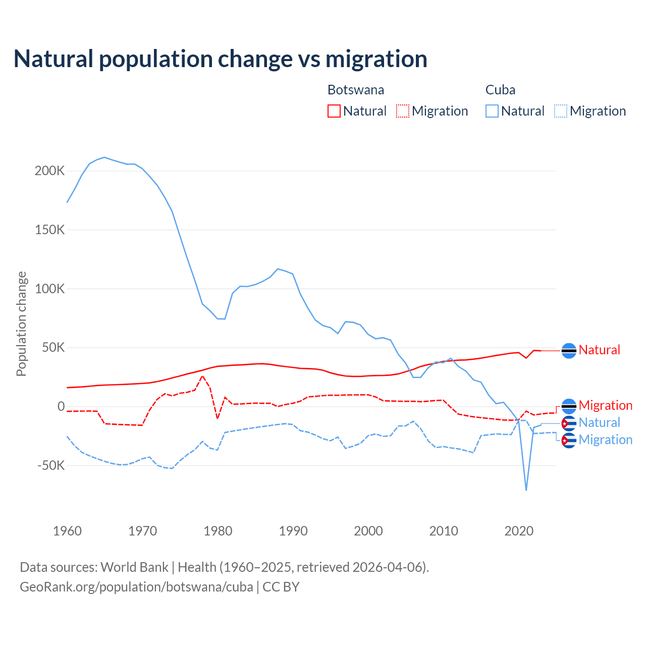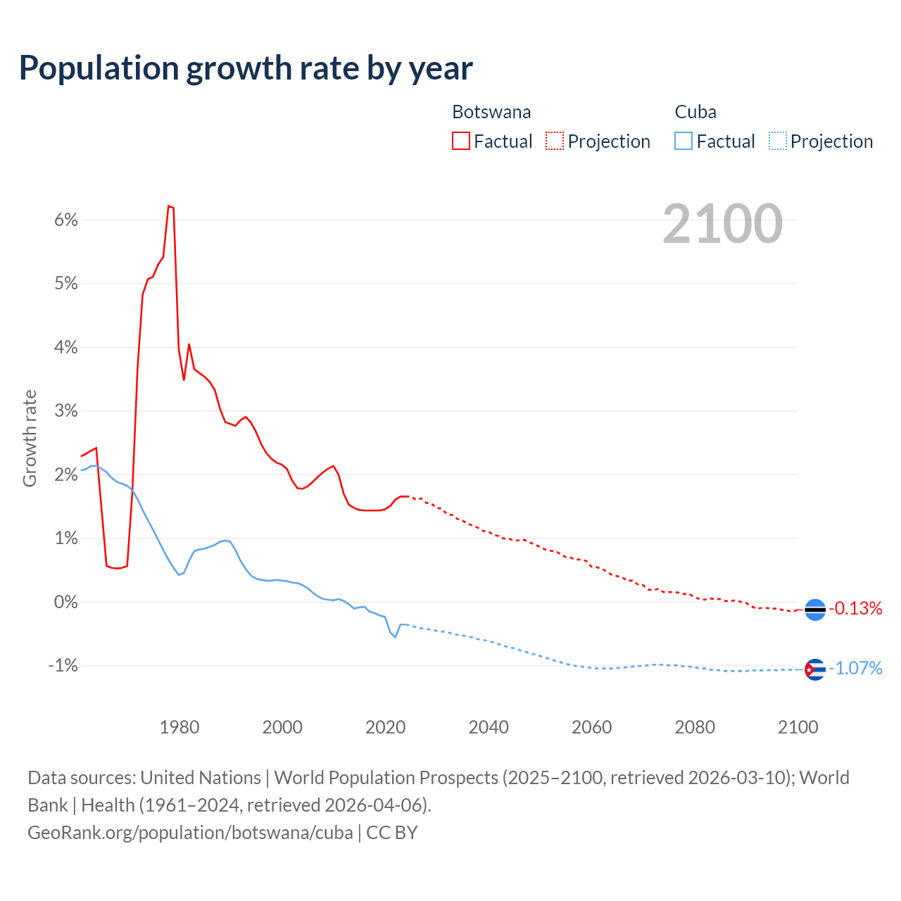 - For the last 10 years, Botswana has had an average growth rate of +1.5% per year vs -0.26% in Cuba.