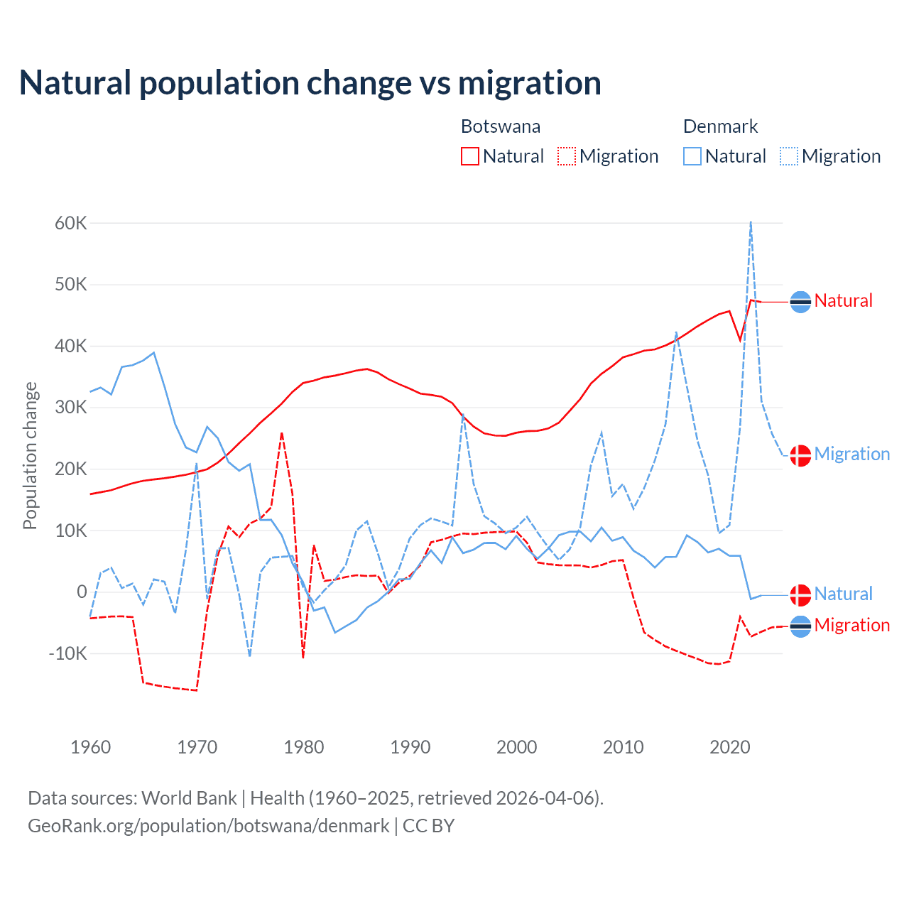 Over the last 10 years, 82.5% of the population change in Botswana is from natural causes (a gain of 436,373 people) and 17.5% is from migration (a loss of 92,293 people). In Denmark 15.4% is from natural causes (a gain of 51,826 people) and 84.6% is from migration (a gain of 284,848 people).
