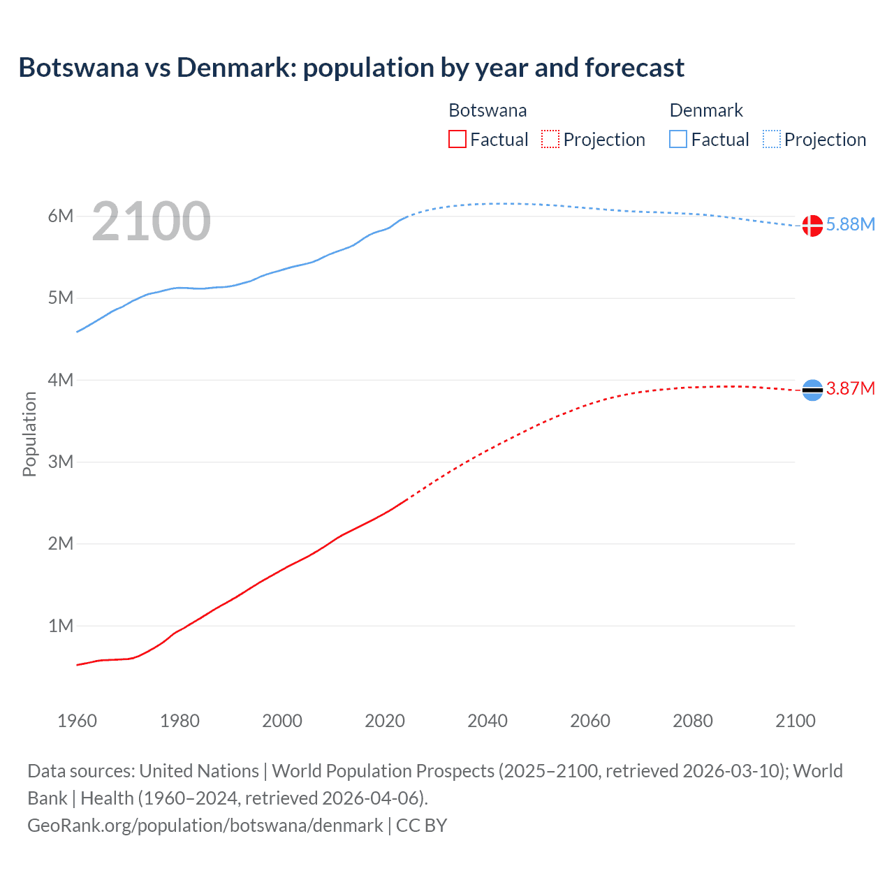 - Since 2006, the population of Botswana has increased from 1.87M people to 2.62M (39.5% growth), while Denmark has grown from 5.44M to 6.03M (10.9% growth).