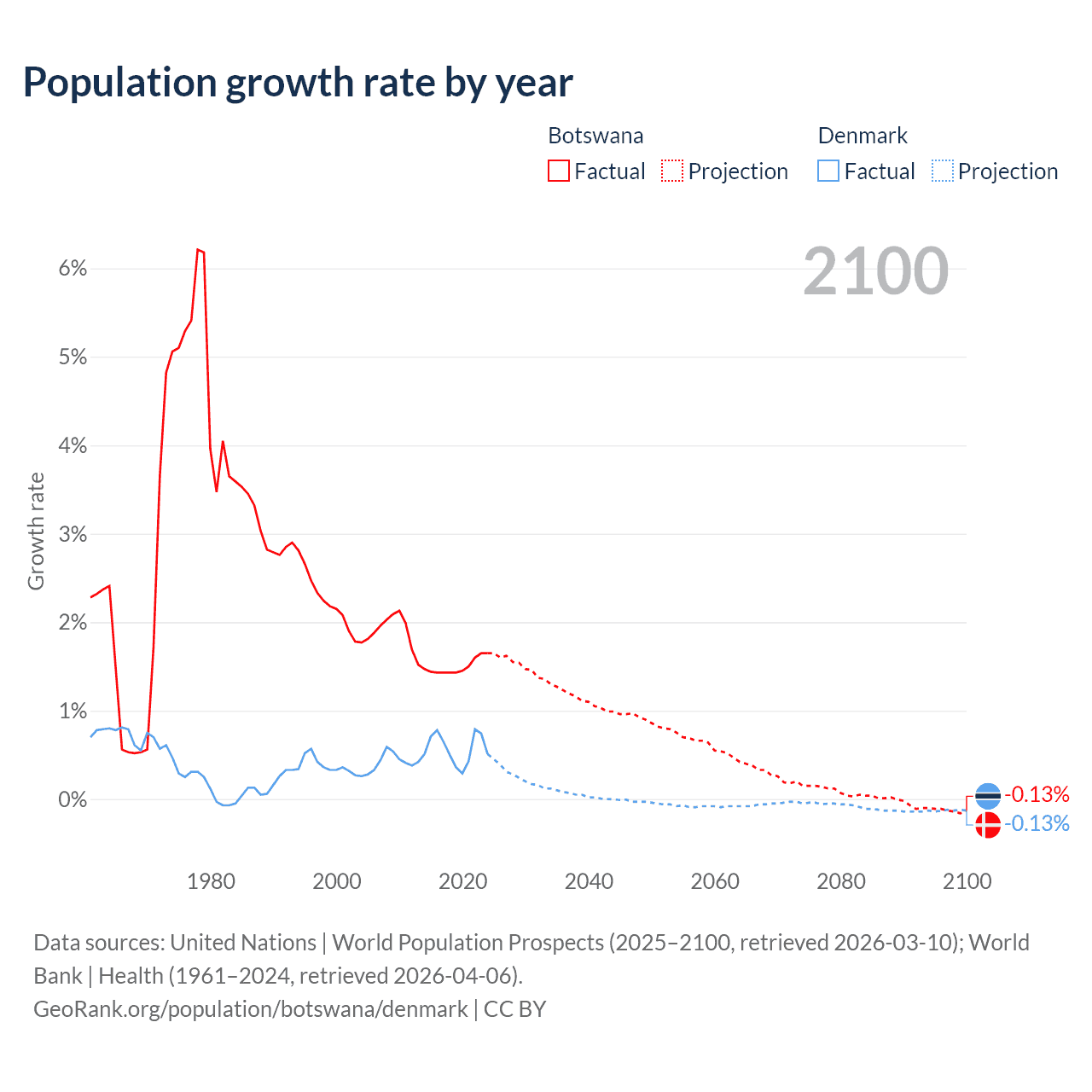 - For the last 10 years, Botswana has had an average growth rate of +1.5% per year vs +0.57% in Denmark.