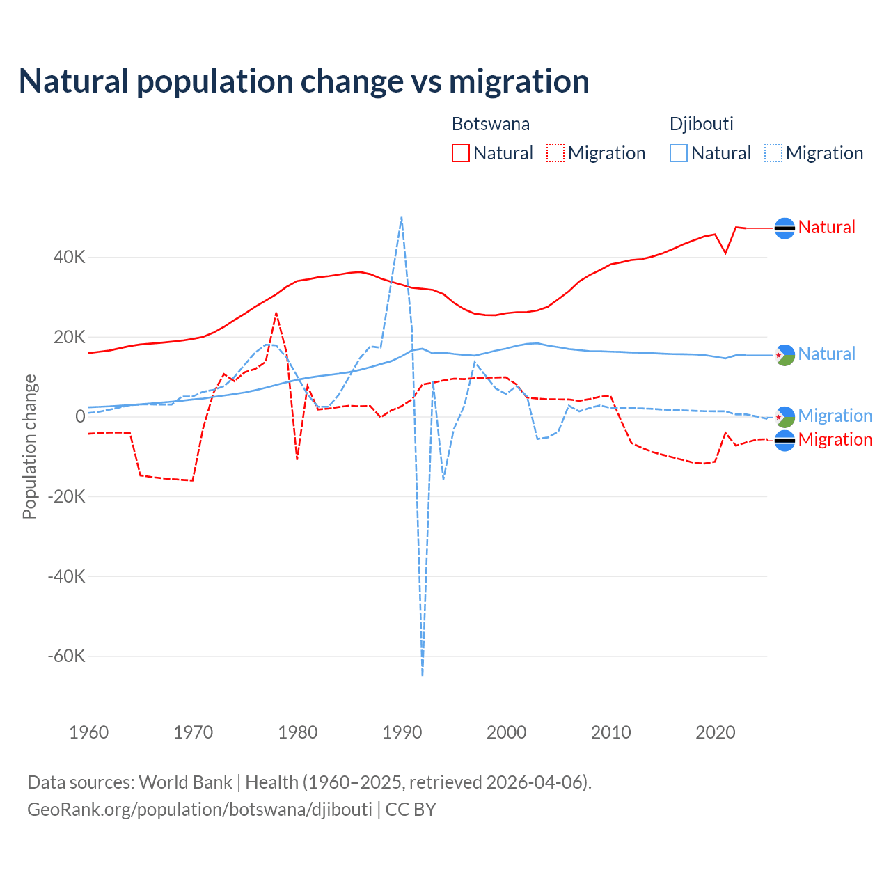 Over the last 10 years, 82.5% of the population change in Botswana is from natural causes (a gain of 436,373 people) and 17.5% is from migration (a loss of 92,293 people). In Djibouti 92.1% is from natural causes (a gain of 153,892 people) and 7.87% is from migration (a gain of 13,138 people).