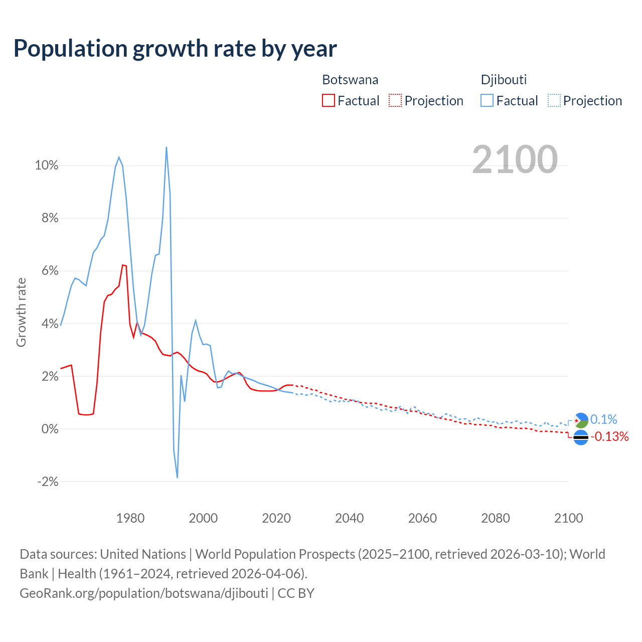 - For the last 10 years, Botswana has had an average growth rate of +1.5% per year vs +1.57% in Djibouti.