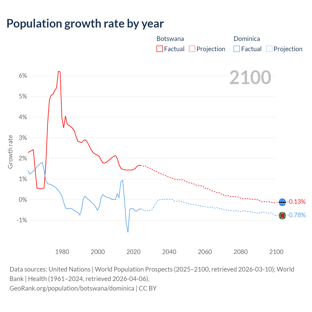 - For the last 10 years, Botswana has had an average growth rate of +1.5% per year vs -0.47% in Dominica.