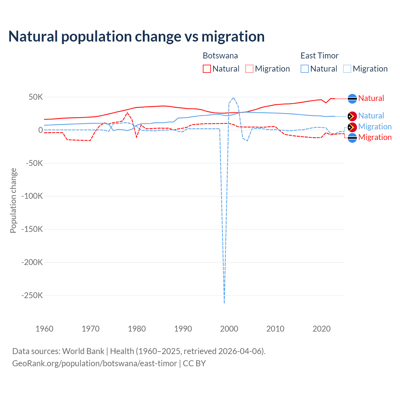 Over the last 10 years, 82.5% of the population change in Botswana is from natural causes (a gain of 436,373 people) and 17.5% is from migration (a loss of 92,293 people). In East Timor 98.3% is from natural causes (a gain of 217,698 people) and 1.66% is from migration (a gain of 3,665 people).