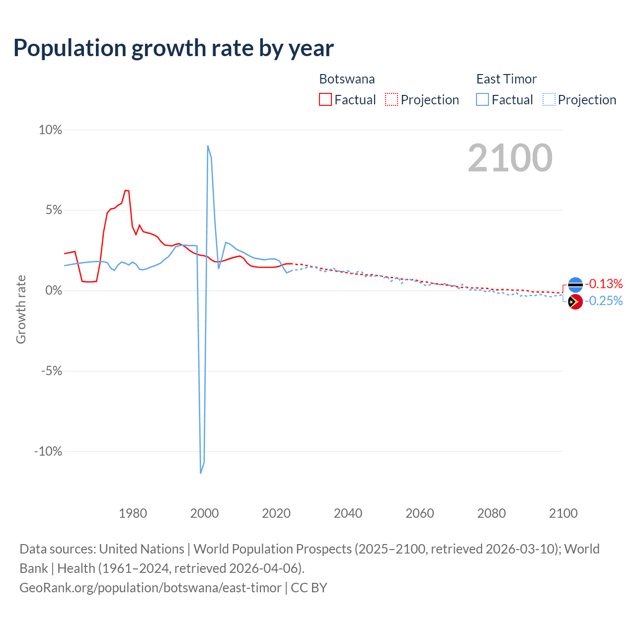 - For the last 10 years, Botswana has had an average growth rate of +1.5% per year vs +1.74% in East Timor.