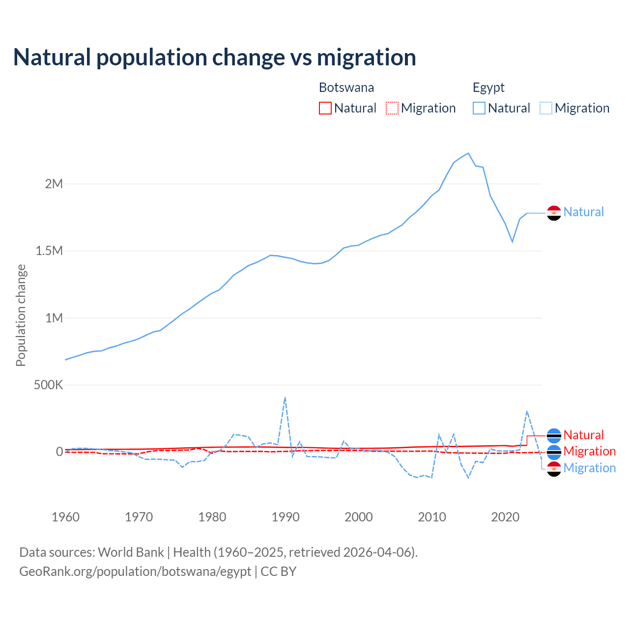 Over the last 10 years, 82.5% of the population change in Botswana is from natural causes (a gain of 436,373 people) and 17.5% is from migration (a loss of 92,293 people). In Egypt 99.6% is from natural causes (a gain of 19,180,073 people) and 0.41% is from migration (a loss of 78,975 people).