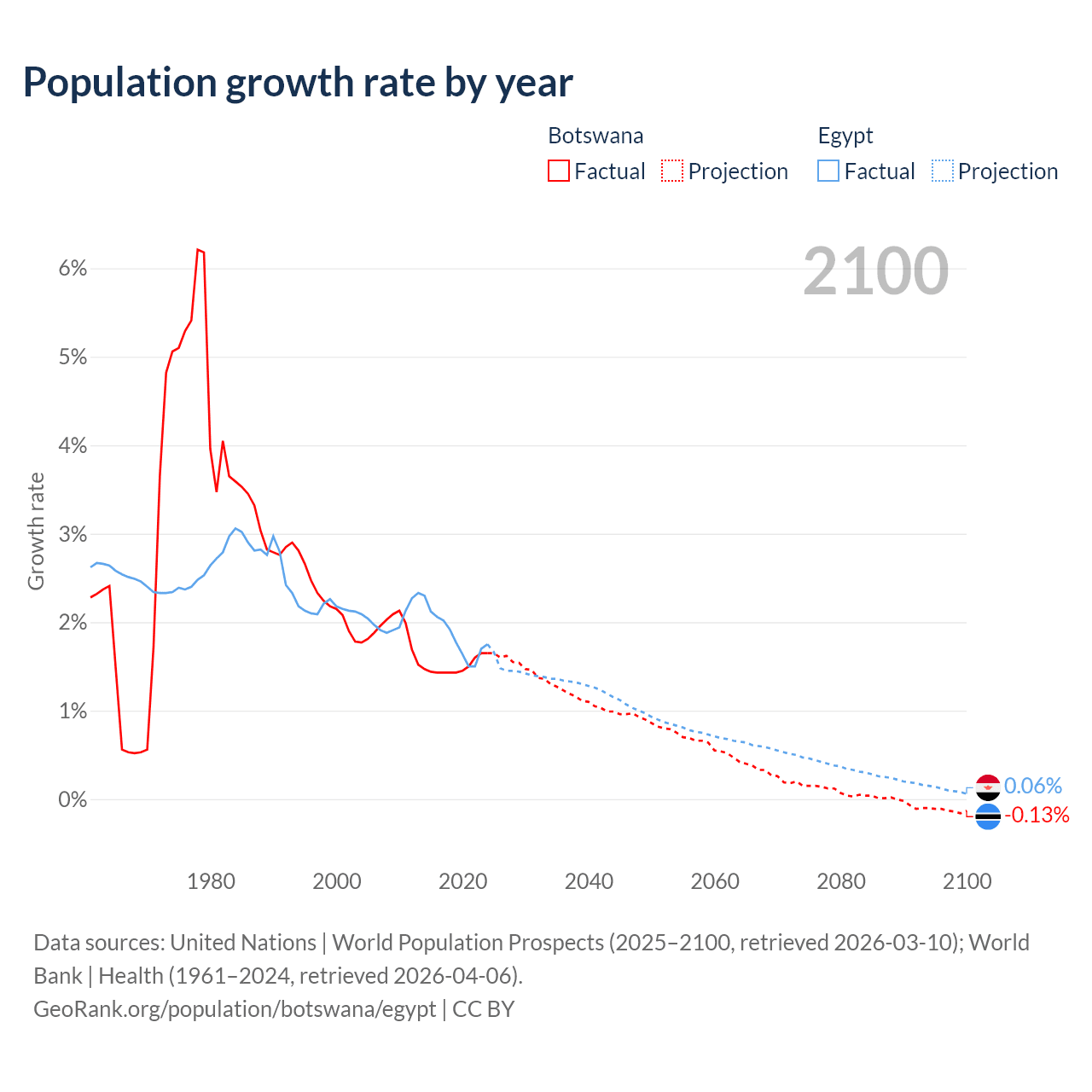 - For the last 10 years, Botswana has had an average growth rate of +1.5% per year vs +1.84% in Egypt.