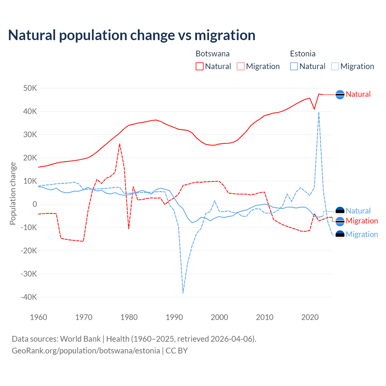 Over the last 10 years, 82.5% of the population change in Botswana is from natural causes (a gain of 436,373 people) and 17.5% is from migration (a loss of 92,293 people). In Estonia 26.1% is from natural causes (a loss of 27,683 people) and 73.9% is from migration (a gain of 78,553 people).