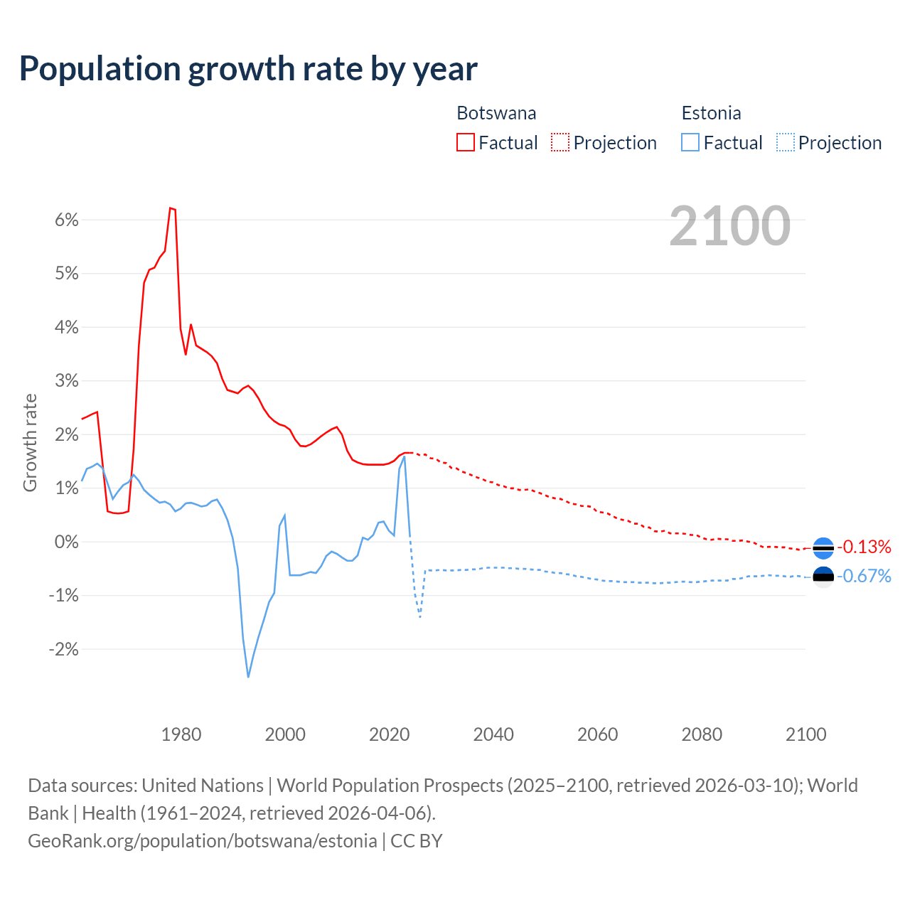 - For the last 10 years, Botswana has had an average growth rate of +1.5% per year vs +0.37% in Estonia.
