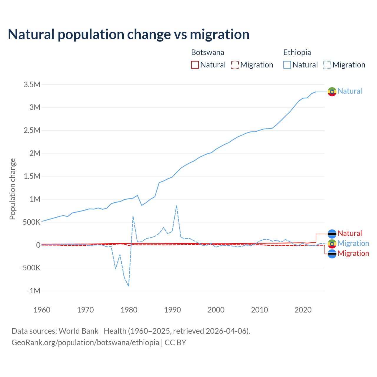 Over the last 10 years, 82.5% of the population change in Botswana is from natural causes (a gain of 436,373 people) and 17.5% is from migration (a loss of 92,293 people). In Ethiopia 98.8% is from natural causes (a gain of 30,237,373 people) and 1.19% is from migration (a gain of 365,488 people).