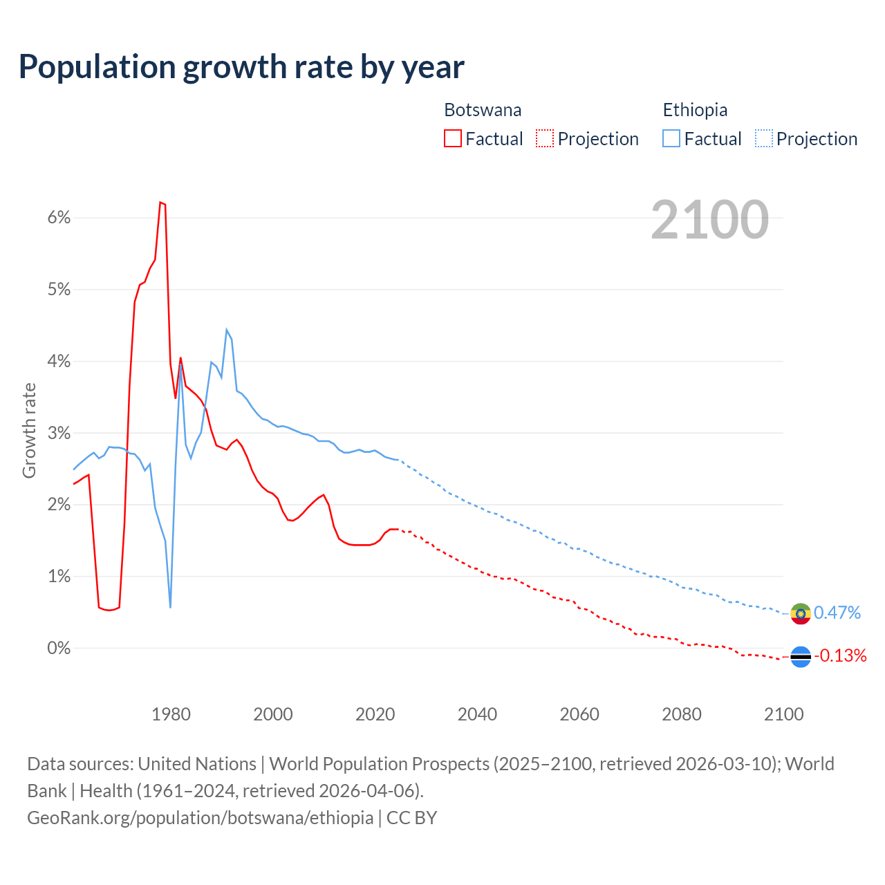 - For the last 10 years, Botswana has had an average growth rate of +1.5% per year vs +2.71% in Ethiopia.