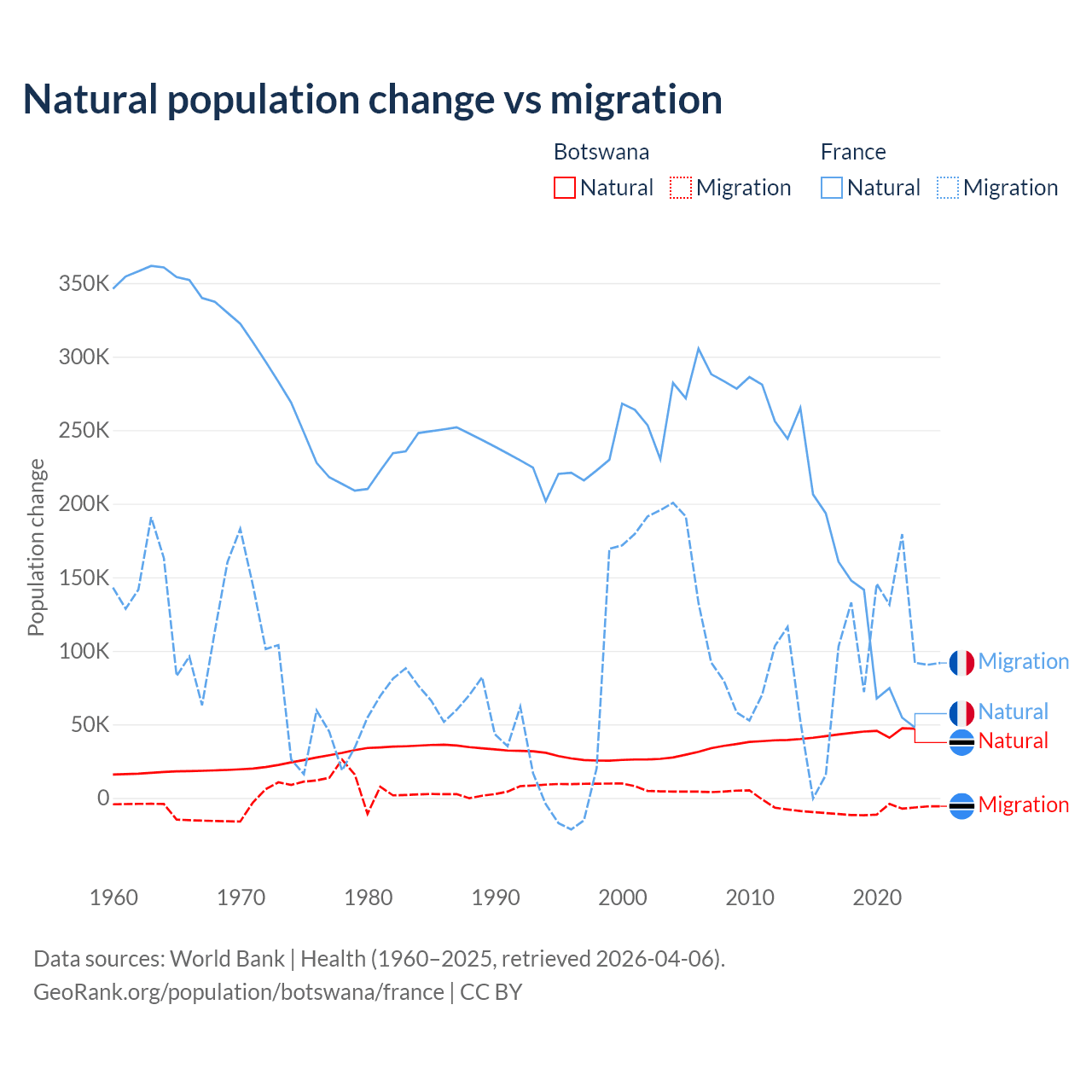 Over the last 10 years, 82.5% of the population change in Botswana is from natural causes (a gain of 436,373 people) and 17.5% is from migration (a loss of 92,293 people). In France 59.5% is from natural causes (a gain of 1,359,540 people) and 40.5% is from migration (a gain of 923,723 people).