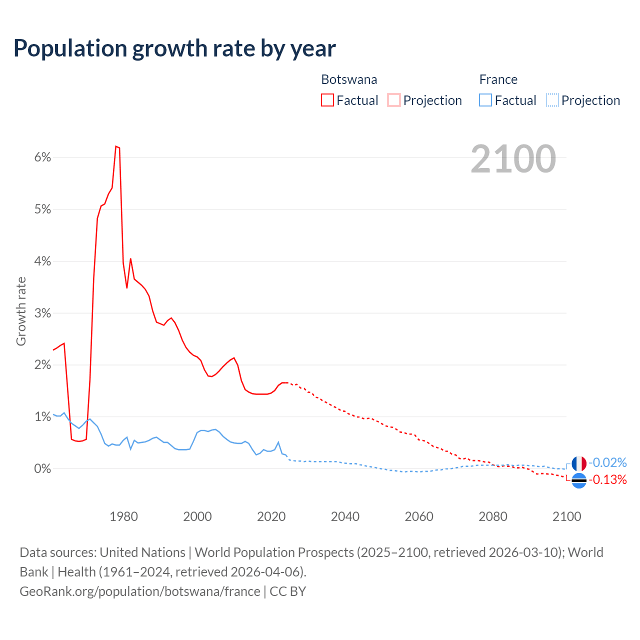 - For the last 10 years, Botswana has had an average growth rate of +1.5% per year vs +0.35% in France.
