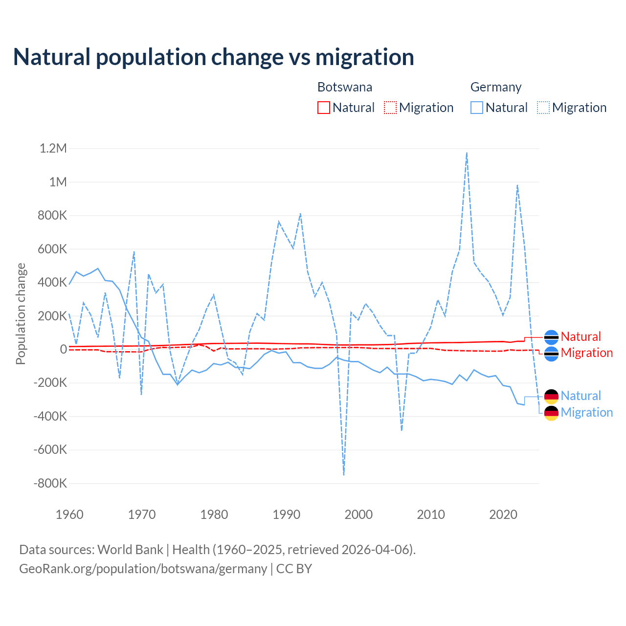 Over the last 10 years, 82.5% of the population change in Botswana is from natural causes (a gain of 436,373 people) and 17.5% is from migration (a loss of 92,293 people). In Germany 26.8% is from natural causes (a loss of 2,036,130 people) and 73.2% is from migration (a gain of 5,565,916 people).