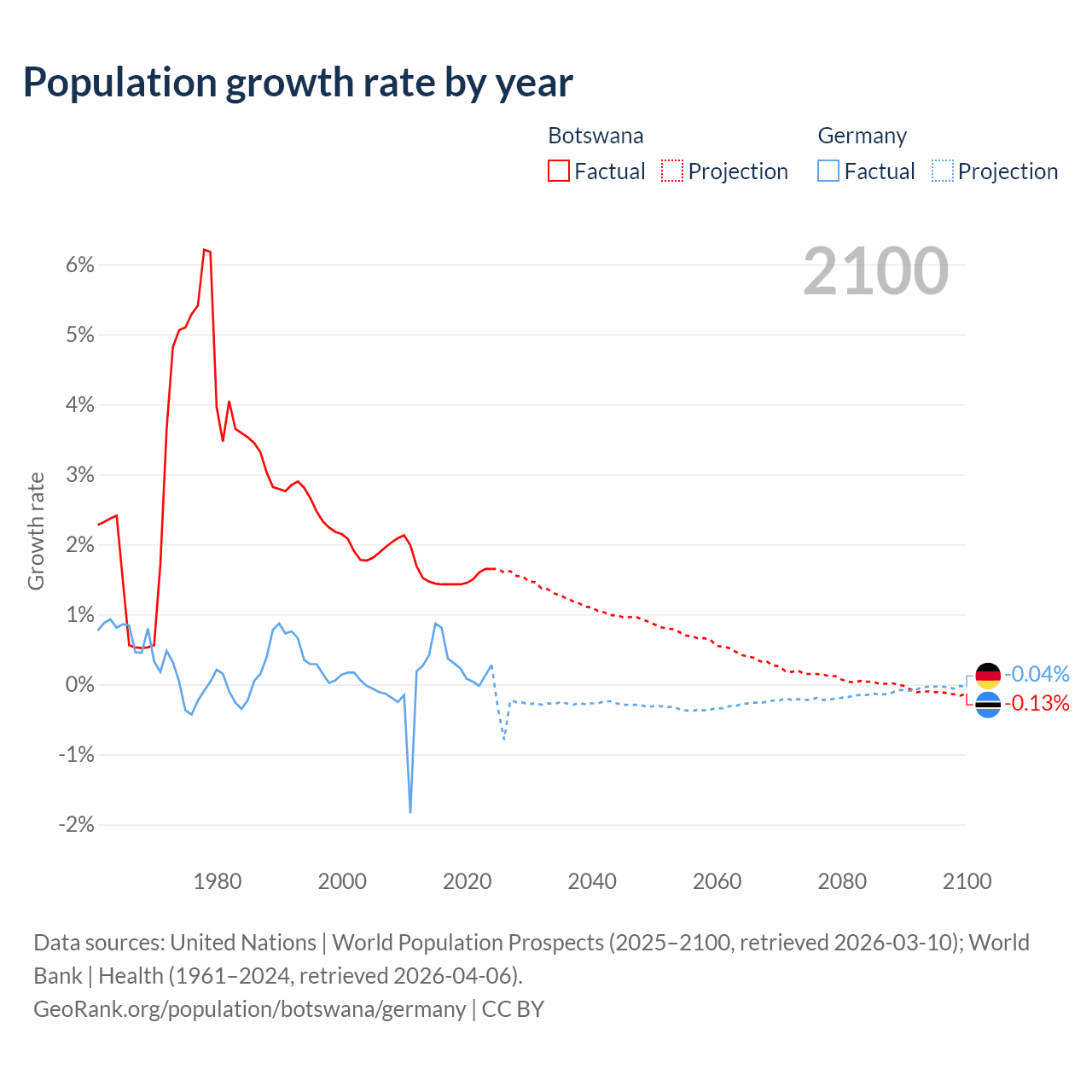 - For the last 10 years, Botswana has had an average growth rate of +1.5% per year vs +0.32% in Germany.