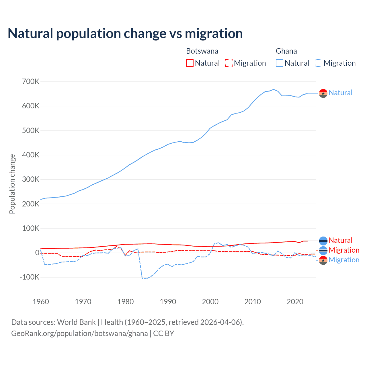 Over the last 10 years, 82.5% of the population change in Botswana is from natural causes (a gain of 436,373 people) and 17.5% is from migration (a loss of 92,293 people). In Ghana 98.6% is from natural causes (a gain of 6,484,449 people) and 1.37% is from migration (a loss of 90,310 people).