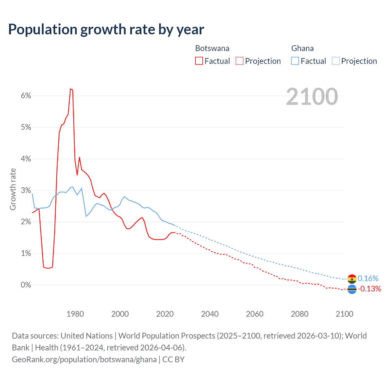 - For the last 10 years, Botswana has had an average growth rate of +1.5% per year vs +2.1% in Ghana.