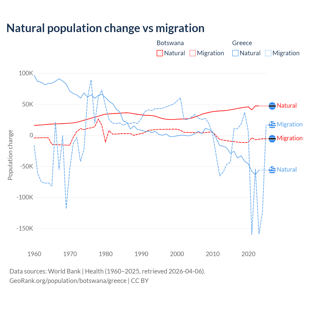 Over the last 10 years, 82.5% of the population change in Botswana is from natural causes (a gain of 436,373 people) and 17.5% is from migration (a loss of 92,293 people). In Greece 51.9% is from natural causes (a loss of 411,426 people) and 48.1% is from migration (a loss of 381,824 people).