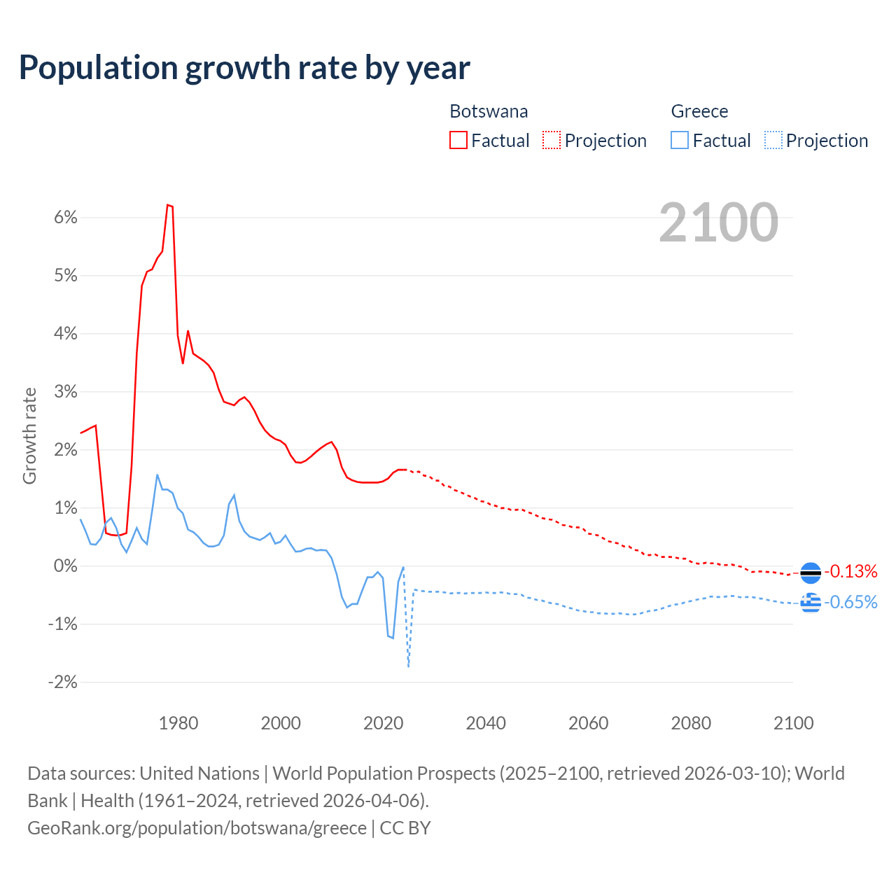 - For the last 10 years, Botswana has had an average growth rate of +1.5% per year vs -0.47% in Greece.