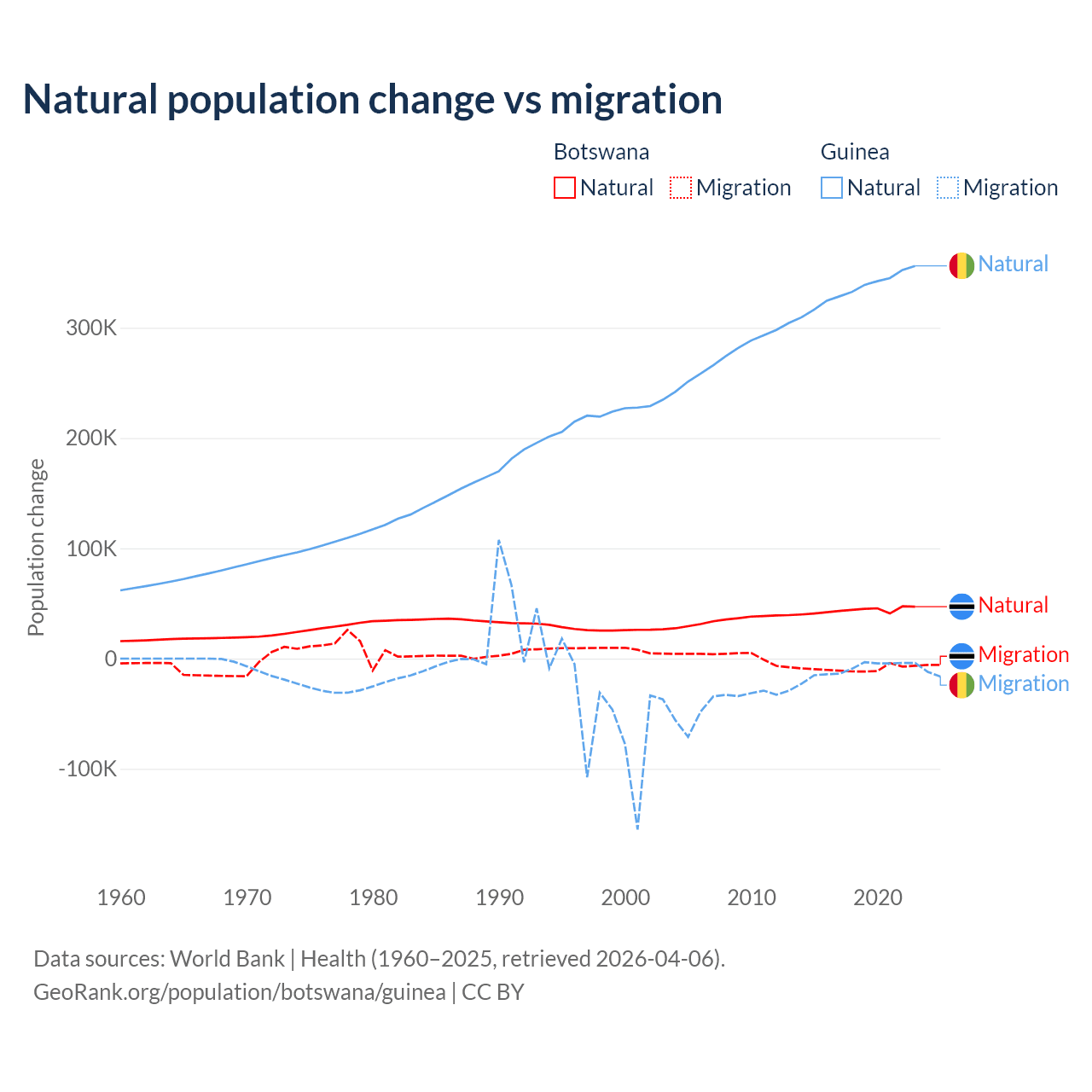 Over the last 10 years, 82.5% of the population change in Botswana is from natural causes (a gain of 436,373 people) and 17.5% is from migration (a loss of 92,293 people). In Guinea 97.2% is from natural causes (a gain of 3,346,936 people) and 2.76% is from migration (a loss of 94,924 people).