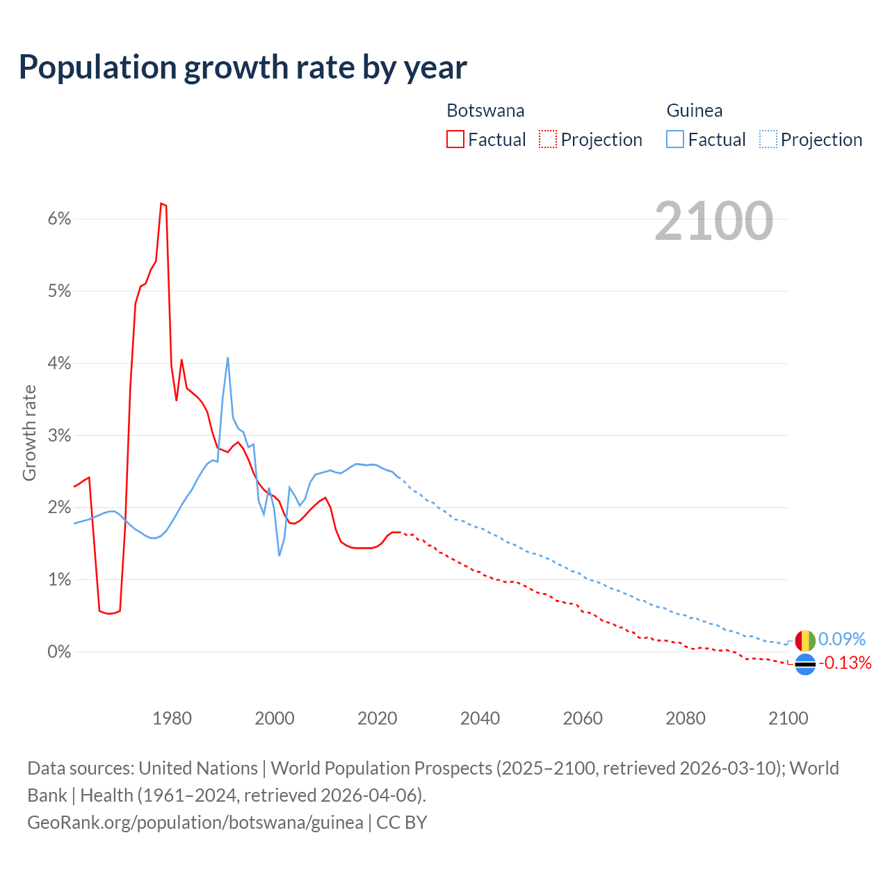 - For the last 10 years, Botswana has had an average growth rate of +1.5% per year vs +2.54% in Guinea.