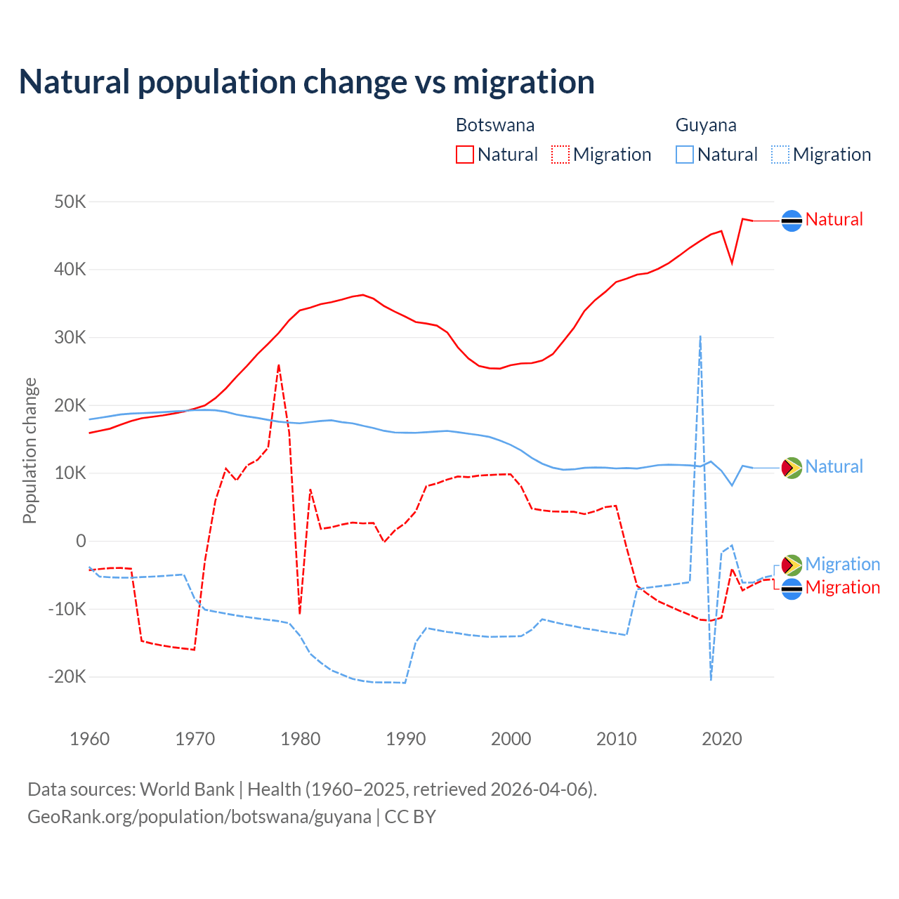 Over the last 10 years, 82.5% of the population change in Botswana is from natural causes (a gain of 436,373 people) and 17.5% is from migration (a loss of 92,293 people). In Guyana 77.7% is from natural causes (a gain of 107,419 people) and 22.3% is from migration (a loss of 30,797 people).