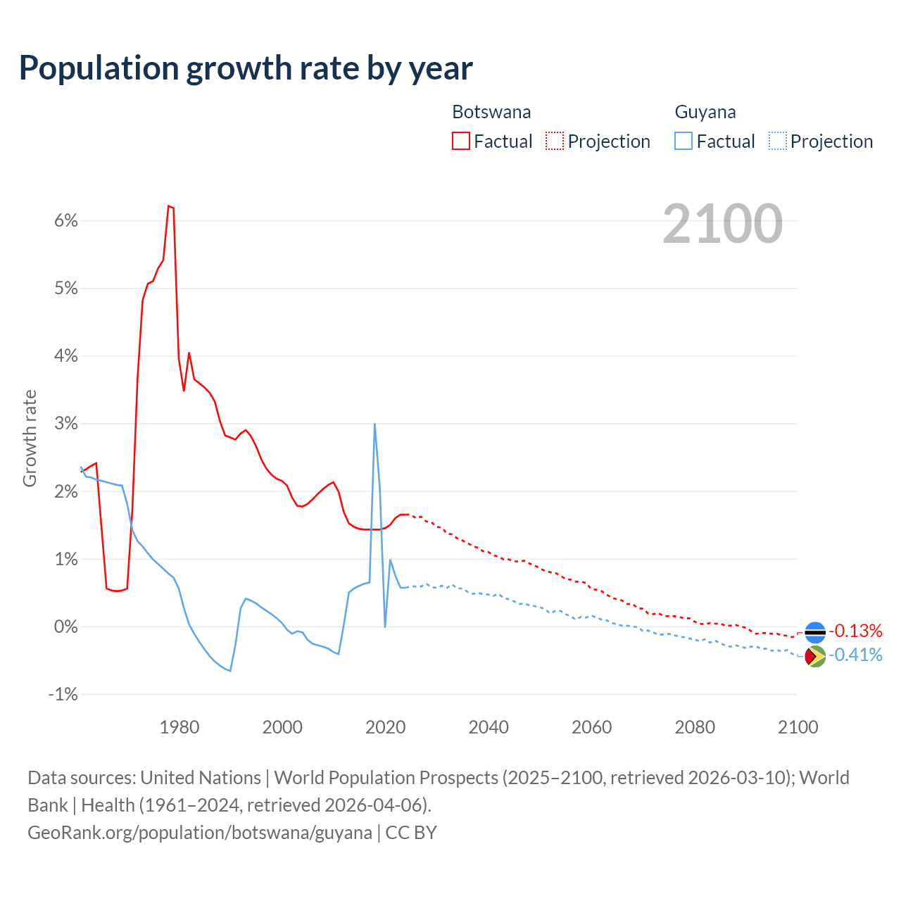 - For the last 10 years, Botswana has had an average growth rate of +1.5% per year vs +0.94% in Guyana.
