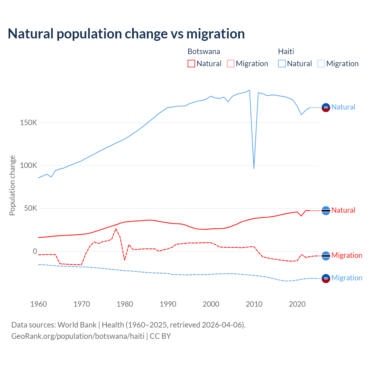 Over the last 10 years, 82.5% of the population change in Botswana is from natural causes (a gain of 436,373 people) and 17.5% is from migration (a loss of 92,293 people). In Haiti 83.9% is from natural causes (a gain of 1,740,319 people) and 16.1% is from migration (a loss of 333,076 people).