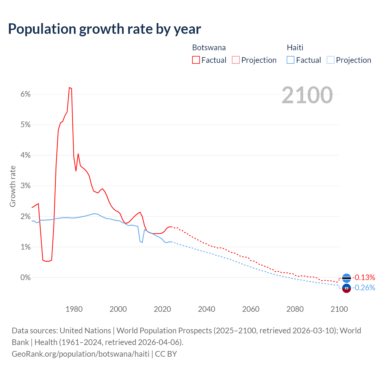 - For the last 10 years, Botswana has had an average growth rate of +1.5% per year vs +1.29% in Haiti.