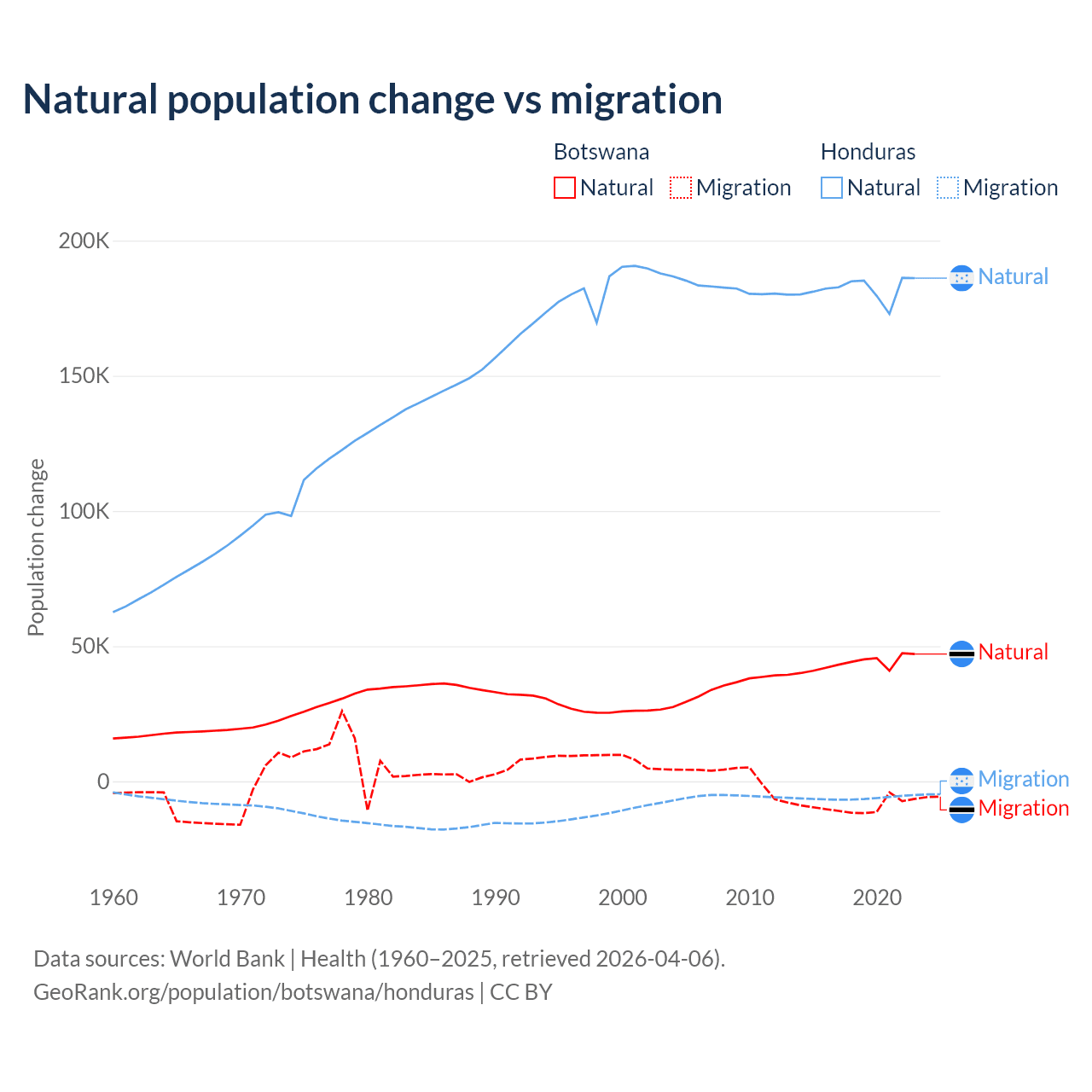 Over the last 10 years, 82.5% of the population change in Botswana is from natural causes (a gain of 436,373 people) and 17.5% is from migration (a loss of 92,293 people). In Honduras 96.7% is from natural causes (a gain of 1,821,125 people) and 3.29% is from migration (a loss of 61,965 people).