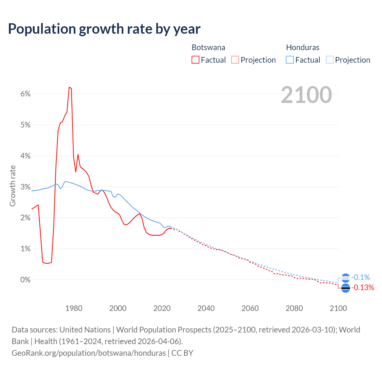 - For the last 10 years, Botswana has had an average growth rate of +1.5% per year vs +1.81% in Honduras.