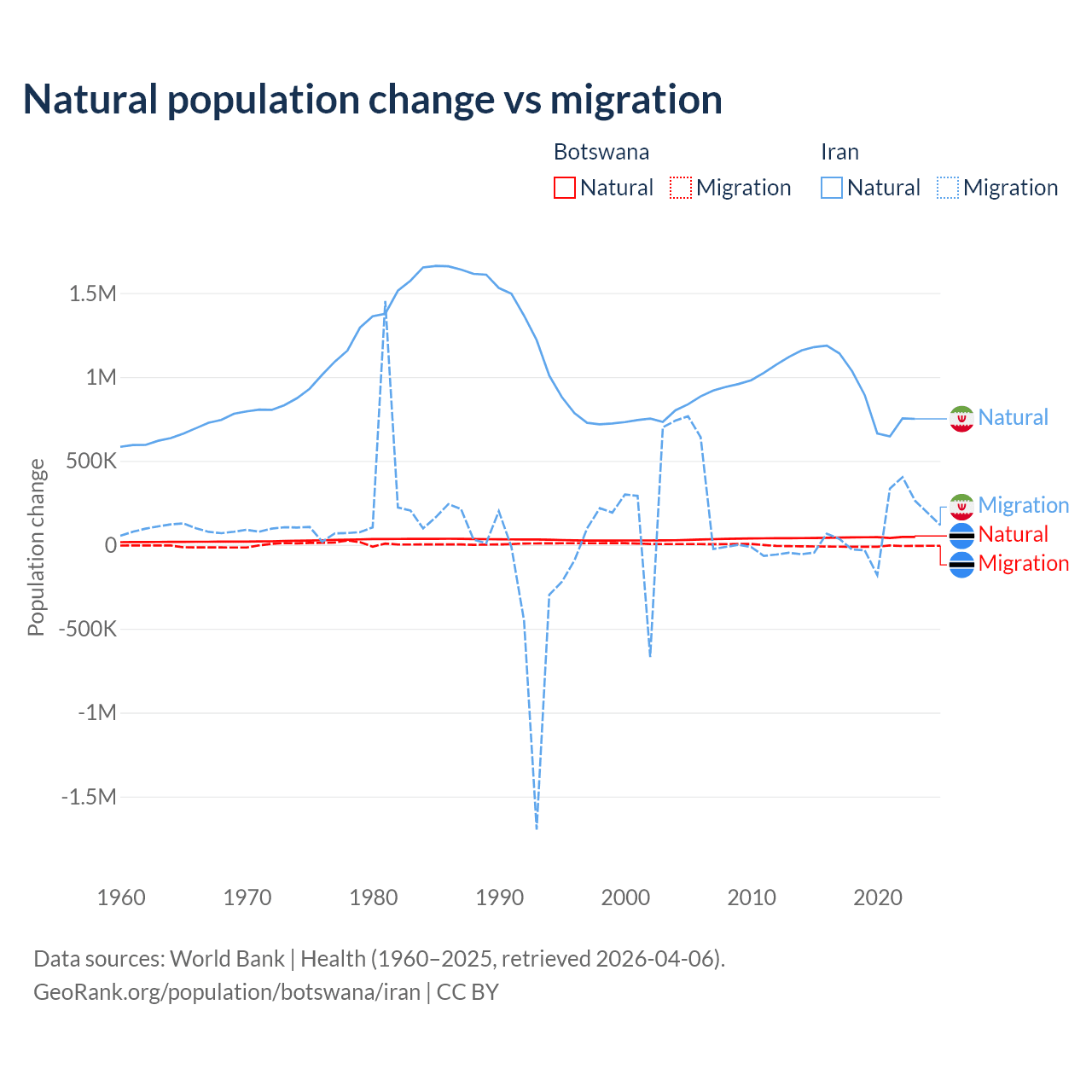 Over the last 10 years, 82.5% of the population change in Botswana is from natural causes (a gain of 436,373 people) and 17.5% is from migration (a loss of 92,293 people). In Iran 92.5% is from natural causes (a gain of 9,405,860 people) and 7.46% is from migration (a gain of 757,979 people).