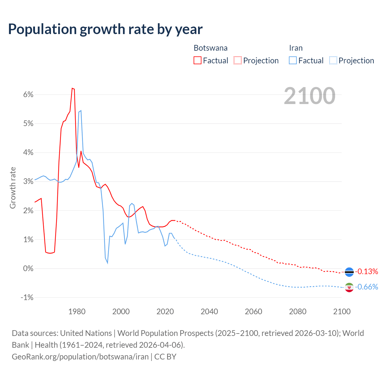 - For the last 10 years, Botswana has had an average growth rate of +1.5% per year vs +1.19% in Iran.