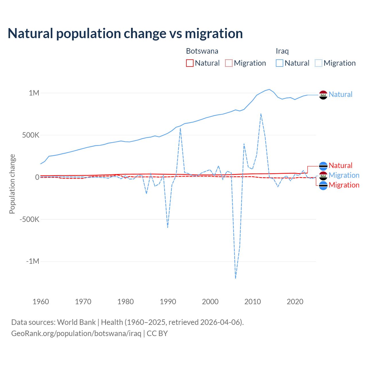 Over the last 10 years, 82.5% of the population change in Botswana is from natural causes (a gain of 436,373 people) and 17.5% is from migration (a loss of 92,293 people). In Iraq 99.2% is from natural causes (a gain of 9,598,842 people) and 0.76% is from migration (a loss of 73,050 people).