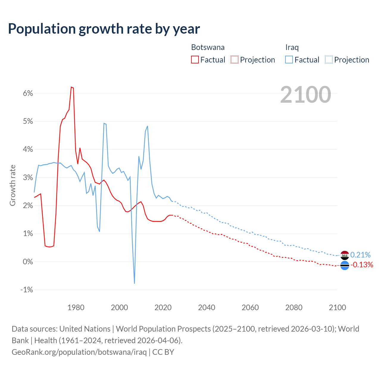 - For the last 10 years, Botswana has had an average growth rate of +1.5% per year vs +2.45% in Iraq.