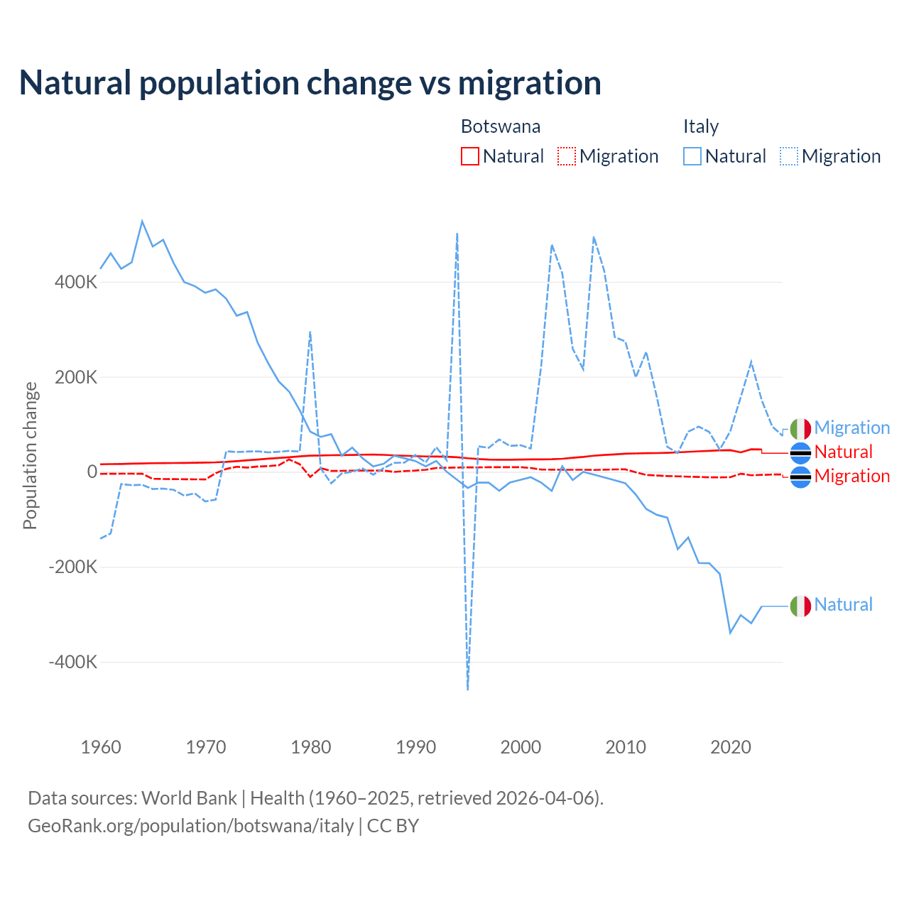 Over the last 10 years, 82.5% of the population change in Botswana is from natural causes (a gain of 436,373 people) and 17.5% is from migration (a loss of 92,293 people). In Italy 68.6% is from natural causes (a loss of 2,239,084 people) and 31.4% is from migration (a gain of 1,026,128 people).