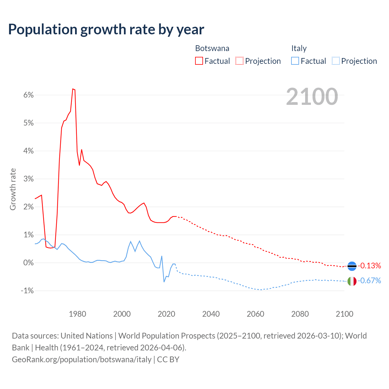 - For the last 10 years, Botswana has had an average growth rate of +1.5% per year vs -0.21% in Italy.