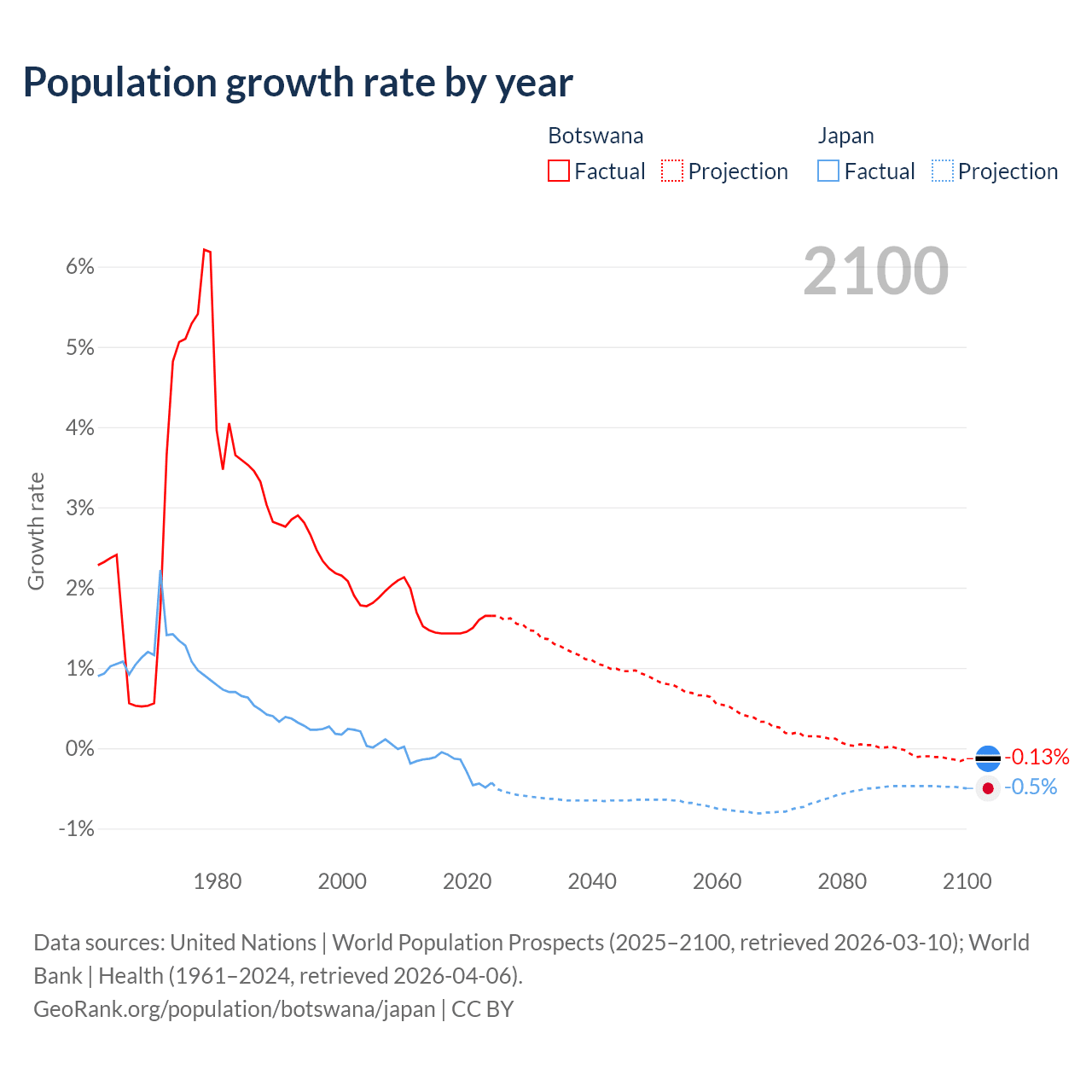 - For the last 10 years, Botswana has had an average growth rate of +1.5% per year vs -0.25% in Japan.