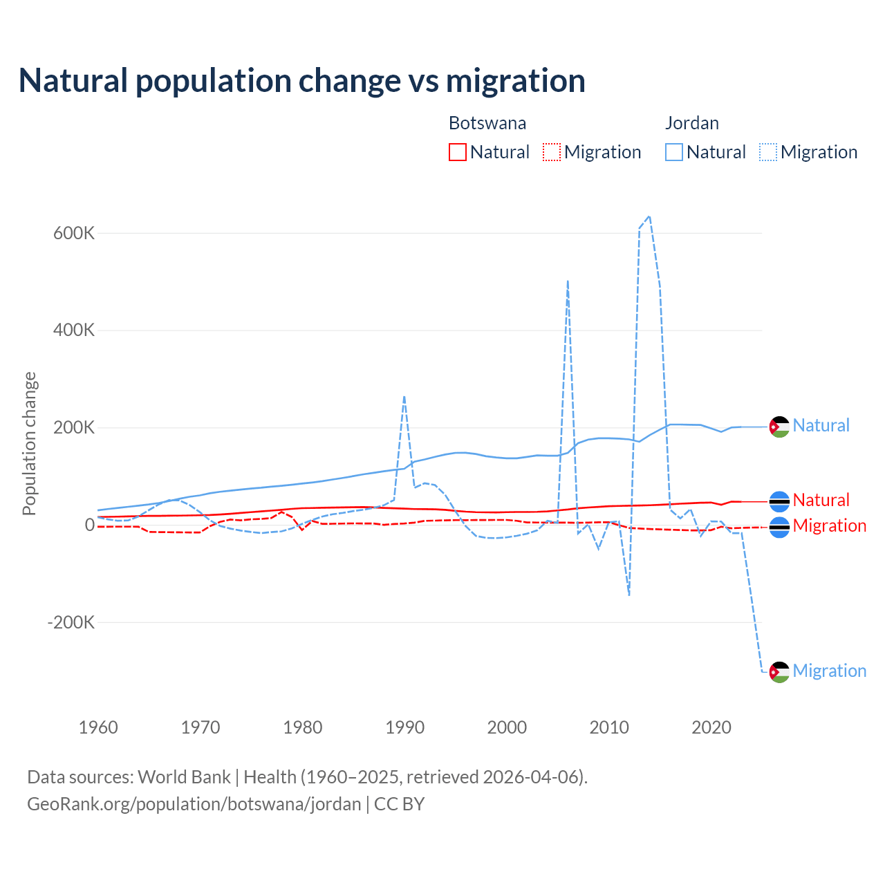 Over the last 10 years, 82.5% of the population change in Botswana is from natural causes (a gain of 436,373 people) and 17.5% is from migration (a loss of 92,293 people). In Jordan 63.2% is from natural causes (a gain of 1,991,452 people) and 36.8% is from migration (a gain of 1,157,625 people).